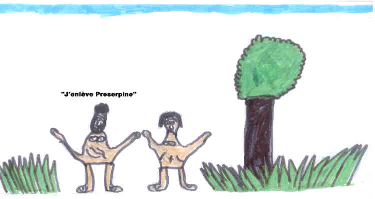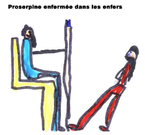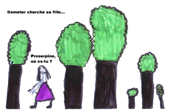 Déméter dit à Zeus que Proserpine avait disparu. Et Zeus ne trouvait pas Proserpine, alors Zeus fit une enquête, et retrouva Proserpine, prisonnière des souterrains.