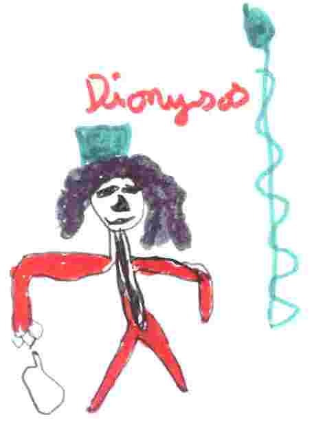Que fait Dionysos ? Il apprend aux gens à cultiver la vigne pour faire du vin. Avec Dionysos, les gens boivent du vin et ils font beaucoup la fête : c'est les Dionysies.