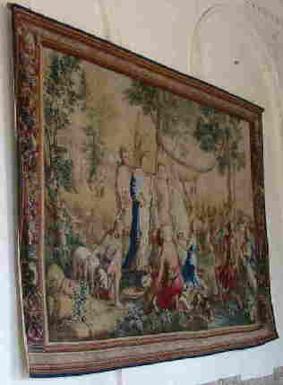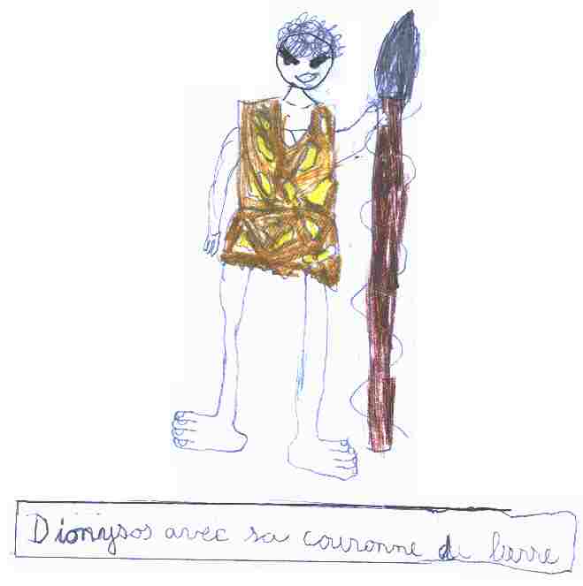 On a vu une tapisserie qui montre Dionysos sur un char avec Ariane. Sur la tapisserie on voit des petits amours et des personnes qui font la fête. Dionysos porte une thyrse et une couronne de lierre. Dionysos a rencontré Ariane sur une île alors qu'elle venait de se faire abandonner par Thésée. On voit le bateau de Thésée qui part au loin.