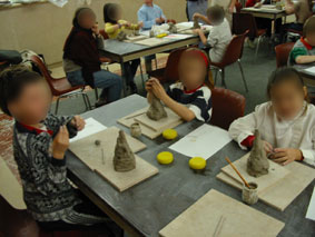 On commence par faire le corps et on l’enfonce sur le socle. Après, il faut faire les pieds ou les pattes si c’est un animal en les roulant dans ses mains.